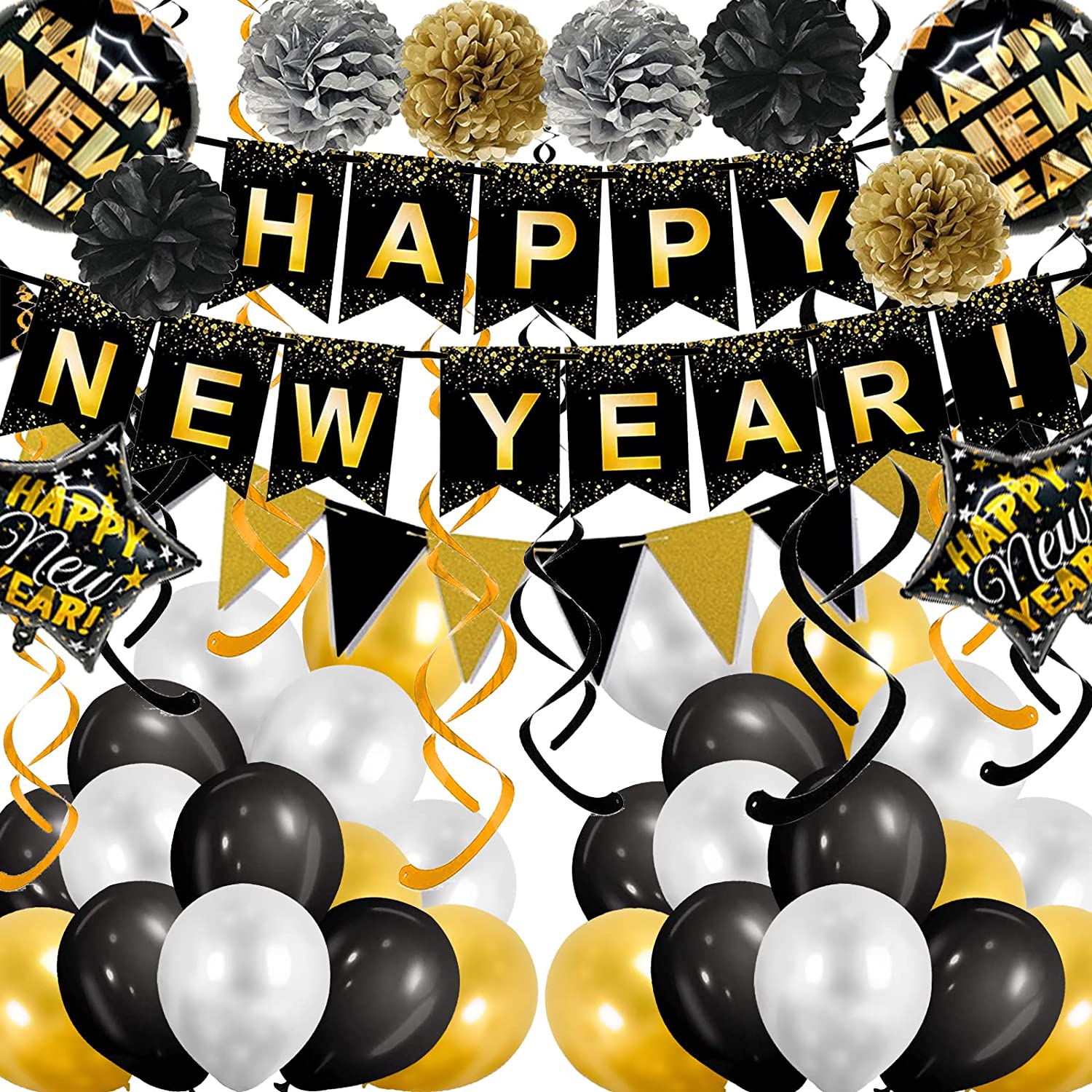FECEDY Black FING 2021 Hello 2022 Banner Pom Poms Streamers Triangle Bunting for New Year Party Decorations