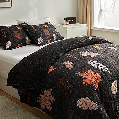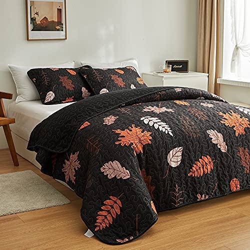 Feelyou Leaves Bedspread King for Kids Autumn Marple Leaf Pattern Bedding Set Quilt Girls Women Ultra Soft Brown Botanical Leaf Branches Quiltd Coverlet Nature Theme Covetlet Set, Black