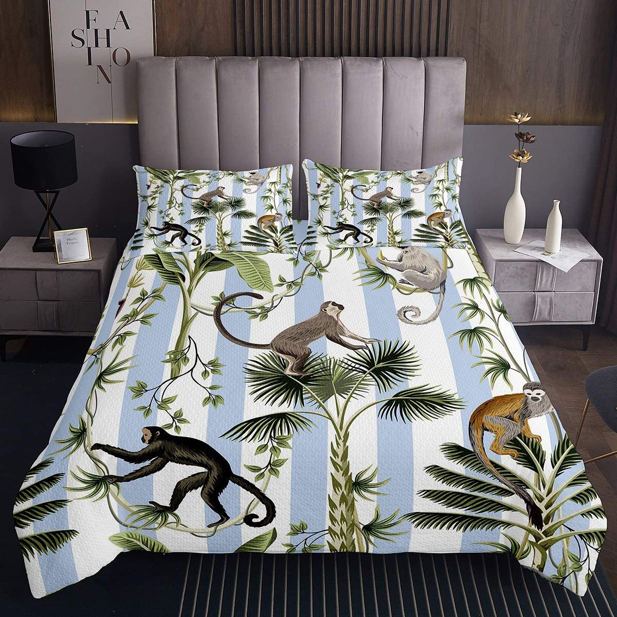 Feelyou Monkey Bedspread Botanical Palm Tree Print Coverlet for Kids Boys Girls Cartoon Animal Quilt Set Blue White Stripes Bed Cover Quilted Bedroom Collection 3Pcs Queen Size