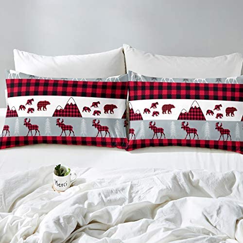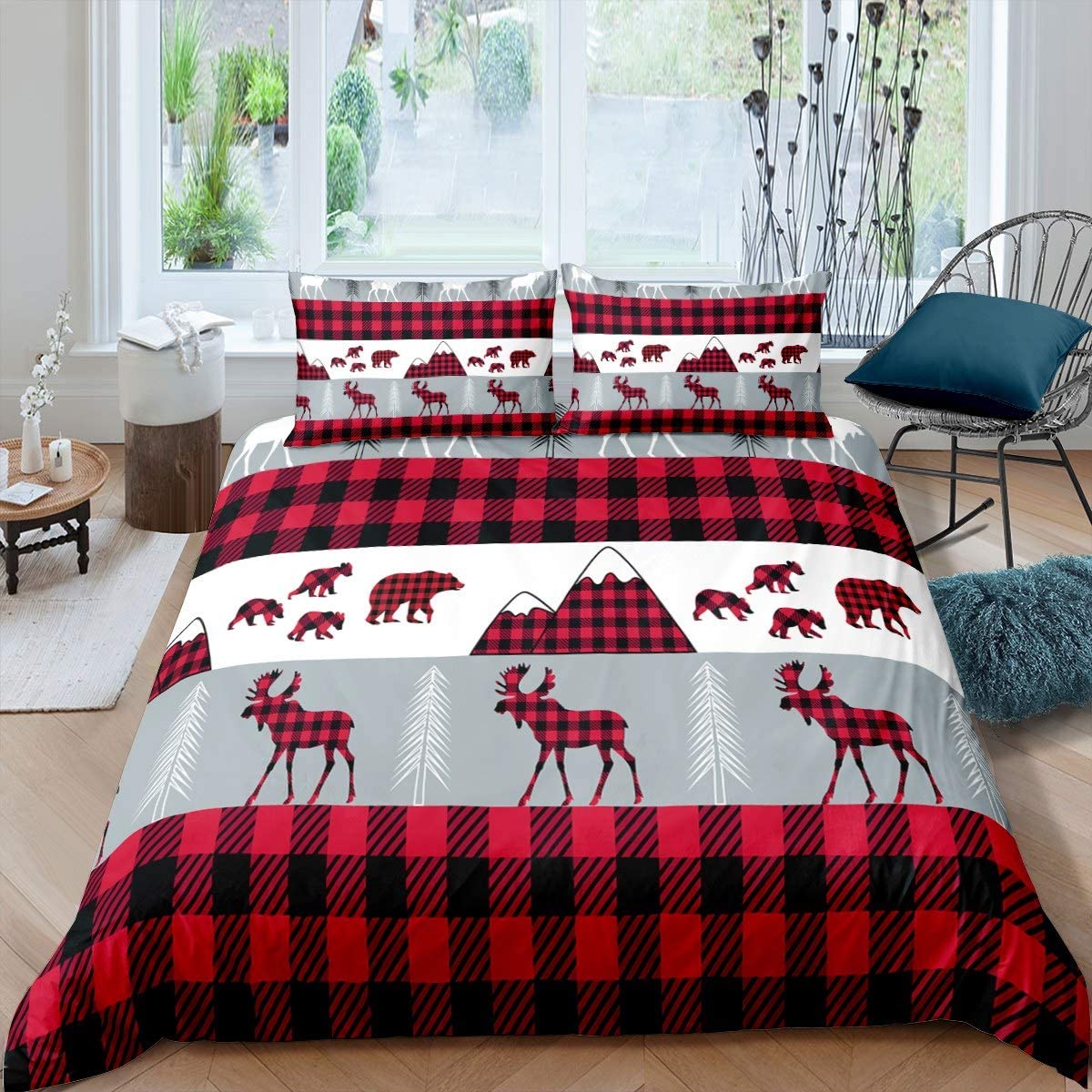 Feelyou Moose Comforter Cover Christmas Theme Bedding Set for Boys Girls Children Red Gird Duvet Cover Bear Mountain Room Decor Xmas Gift Queen Size Quilt Cover 3Pcs