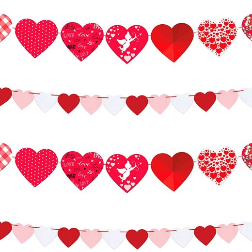 LEVEL UP YOUR PARTY WITH THIS PACK OF 33, RED, ROSE, WHITE HEART VALENTINE GARLAND FOR VALENTINES ROMANTIC DECORATIONS! Perfect for Valentines Day Decorations, Anniversary, Romantic Decorations Special Night Decorations, Surprise Proposal party What You Will Get: Material: Sturdy Felt paper Heart Garland: Pack of 33 Each Heart Measures: 3 inch x 2.5 inch Material: Sturdy Felt paper Heart Garland: 10 Feet 2 Strings with 9 different print pattern