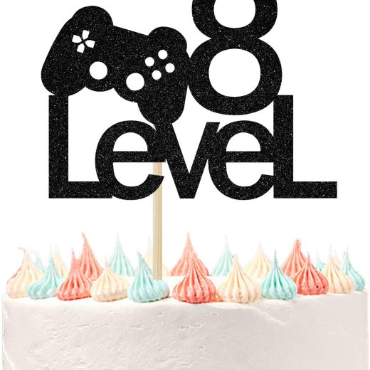 Ferastar Level Up 8 Cake Topper for 8th Birthday Supplies,Happy 8th Birthday,Video Game Themed Gaming Party Decorations Black Glitter.