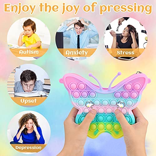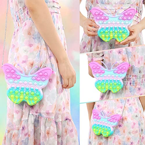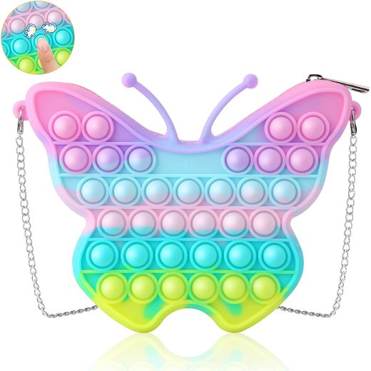 Easter Bag Be Popular Among Kids Unique design with bright color and vivid part of butterfly, this pop shoulder bag can attract boys and girls attentiveness. Press down those bubbles, this pop fidgety toy will make a slight pop sound, enjoy the fun of pressing bubbles, effectively get your kids relieving anxiety and stress. Not only just a fidget toy, this pop shoulder bag fidget toys also can be used for shopping and traveling daily storage. Stress Reliever Pop Fidget Toy Press down the bubbles on this shoulder bag, slight & pleasant sound will relieve stress and anxiety, restore your mood, and creates a fun atmosphere in daily life. The pop fidget toy are suitable for autism, anxiety, ADHD, ADD, OCD to calm down. It is a good helper to relieve work, study, illness, family, office, family stress and make happiness around you. Premium Quality and Enough Capacity for Daily Use The popper fidget toy shoulder bag is made of premium quality silicone with a smooth rubber surface and soft rubber buttons, making it durable, unbreakable and reusable. Very comfortable touch and produce tactile stimulation. Pop fidget toy bag size is 7.87* 6.29* 1.57in, long chain shoulder strap ,lightweight and easy to carry. Theres plenty of space for your phone, wallet, cards, lipstick ,sunglasses and other daily necessities. Stylish Collocation Durable and high quality material let this pop fidget shoulder toy away from getting dirty and damaged. It is washable and reusable. The kids will have a good time playing with it without worrying tear apart this girls shoulder bag. Bright colors and various shapes match with your daily casual outfits will make you more charming than others. Great Gifts for Girl This fidget popper shoulder bag is suitable for kids school supplies and kids party favors. Also it fits adults as well. You can take it anywhere, it is perfect return gifts for kids birthday, goodie bag stuffers, anniversaries, weddings, Christmas, Halloween, celebrations, Valentine gifts, classroom prizes, New Year Party or any other cheerful events.