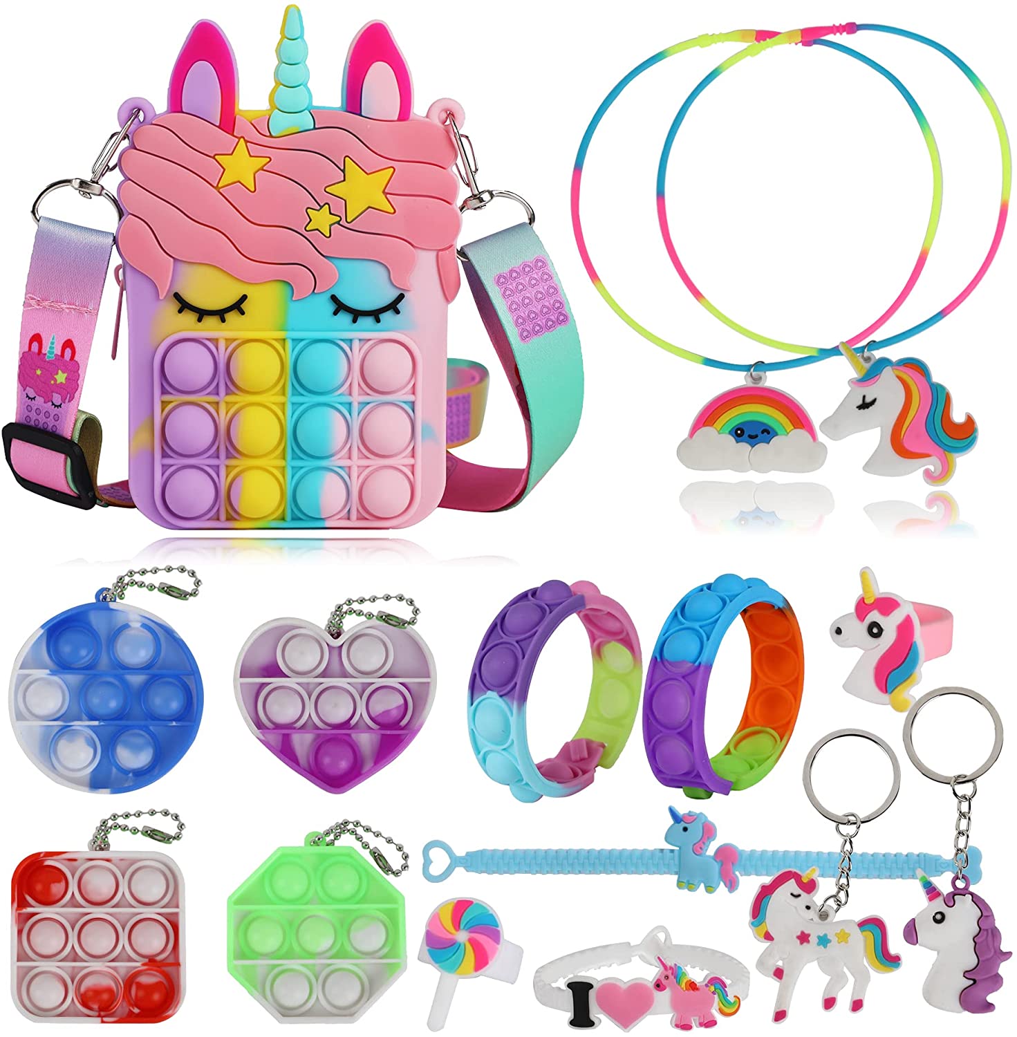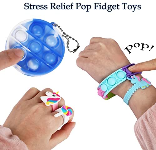 Mini Fidget Purse: this pack of fidget toys includes 14 pcs tiny toys and 1 unicorn mini pop purse, fidget key chains, fidget bracelets, necklace rings, colorful set of lovely gardgets; the fidget purse is good to put coins, lipstick, cards inside Great Gift Idea: with the unicorn fidget purse with cute toys is so good to give as birthday gift, Easter gift, Valentines gift for your daughter, granddaughter, niece, friends’ girls Stress Relief Toys: these bubble fidgets can make your hand busy, mind calm down, get rid of anxiety worries. Specially good sensory toys for autism children with AHD, OCD Easter Basket Stuffers: this fidget toys pack is also good as Easter basket stuffers, classroom prizes for teachers Traveling Toys: easily put into pocket, hand held size, can take to the car, bus, airplane, station, play while waiting, to kill boredom