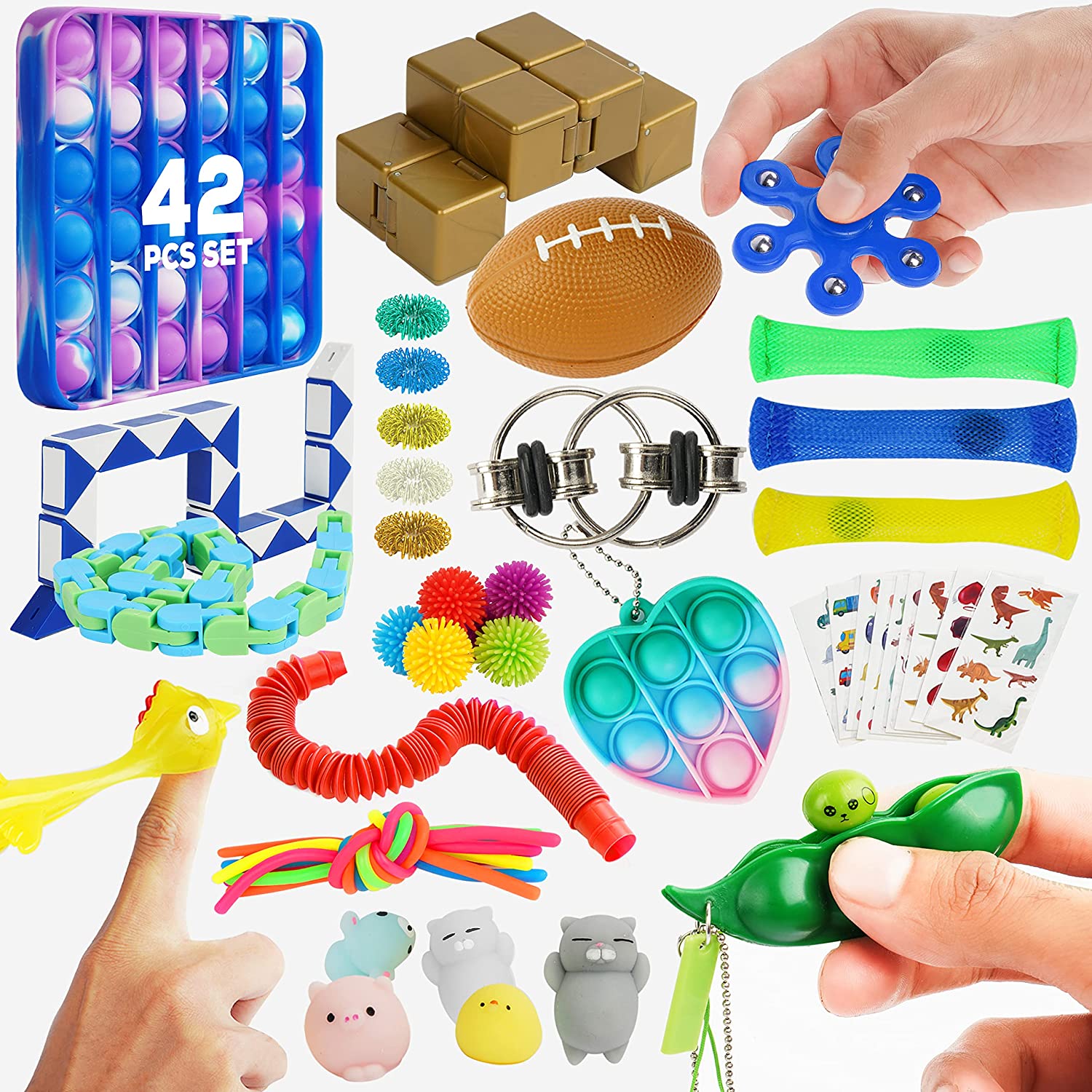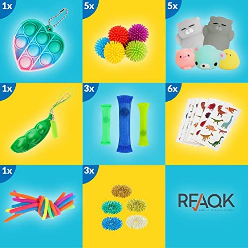 Fidget Box Full of Fidget Things: RFAQK’s 42 Pcs fidget toys and textured sensory toys variety pack has a lot to offer. 1x PopIts. 1x Flip Bike Chain. 1x Infinity Cube. 1x PopIts Love Key Chain. 1x Wacky Track. 1x FidgetSpinner. 1x Snake Cube. 1x Pop Tube. 1x Rugby Ball. 1x Bean Fidget. 3x Mesh & Marble. 3x Catapult Turkeys. 5x Finger Massage Rings. 5x Mouchi Squishy. 5x Stretchy Strings. 5x Spiky Balls. 6x Stickers. Fun Stress Relief Autistic Toys For Everyone: This fidget toy package contains cool gadgets for toddlers, kids, teens, and adults. They are a calm down corner for kindergarten, elementary, high school students. The handheld size allows for easy keep- in pocket, bag, and on desk. Ideal birthday party favors as well. Beneficial for Health & Mind Development: Fidget toys goody bag contains gadgets best for relieving stress, improving focus, increasing tactile sensory awareness, fine motor skills development, calming obsessive-compulsive tendencies, promoting deep thought and creative imagination. Quiet, Odorless & Satisfying: Soft, spongy and cute fidget toys bundle. Squeeze these bright-colored toys for maximum pleasure and physical exercise. Quiet, easy to clean, leakage free and safe for children to play with. Ideal for gift-giving as well. Better Academic Results: This set brings awesome educational fidget toys for studying. Helps develop kids logic thinking and visual perception ability. It will get the little ones interested in STEM (science, technology, engineering and math).