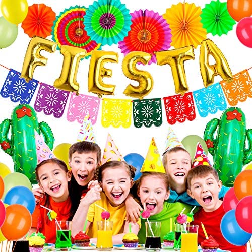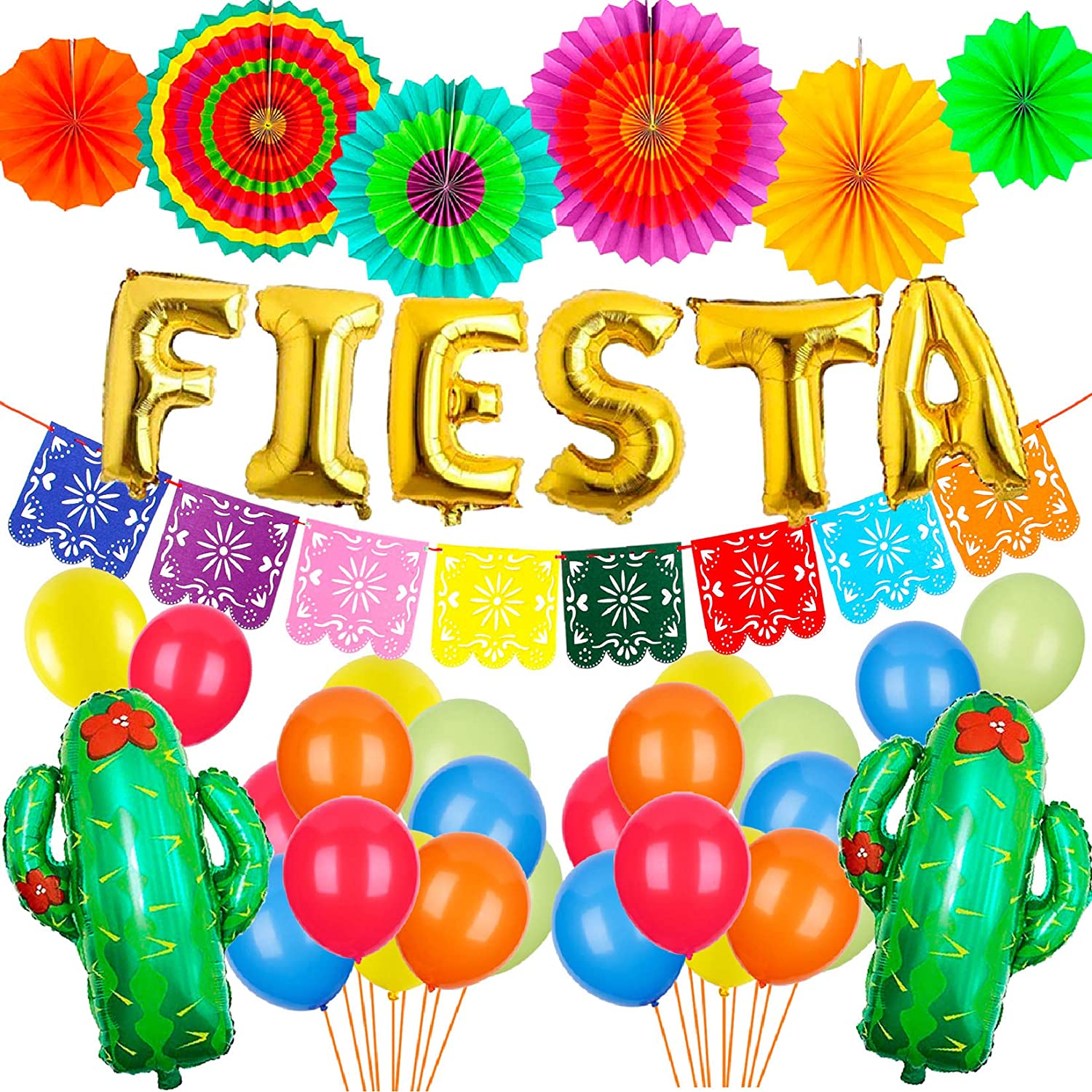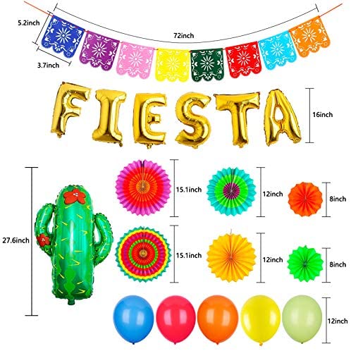 Fiesta Themed Party Decorations Package Includes:1pcs Mexicano Picado Banner, 6pcs Paper fans in 3 size , 2pcs Foil Cactus Balloons, 1pcs FIESTA ba…