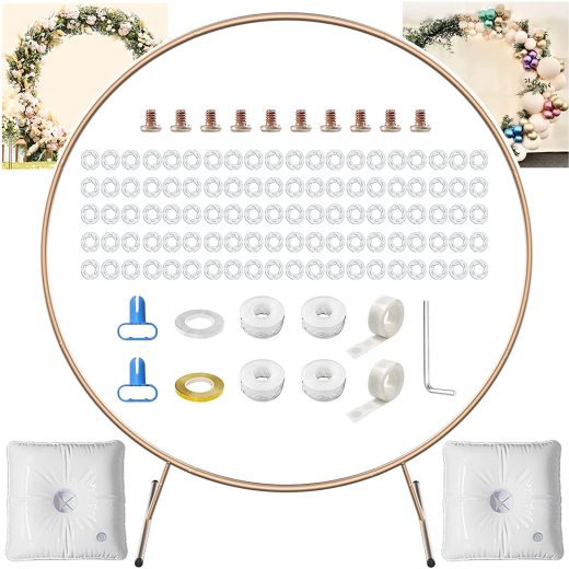 Round Balloon Arch kit include6 arched iron tubes, 2 arched iron tubes with feet, 2 T-shaped base, 2 water bag, 10 fixing nut, 1 wrench, 100 balloon clip, 2 balloon glue dot, 2 balloon knotter, 4 balloon tape strip, 2 colored ribbon and English instructions. Use Your Imagination Arch decoration is one of the most popular party decorations nowadays. you can decorate it with balloons, flowers, plants, light pendants and other elements to create a personalized backdrop for the arch. It can be used indoors or outdoors. Easy to InstallOur arch stand come with English instructions, please follow the instructions to connect the round pipes in sequence, It can be quickly assembled in 5 minute by one person. Weight Water Bag & Balloon AccessoriesOur 2 water bag can reach 22lb respectively after filling with water, make the round arch not sway when it is blown outdoors by strong winds. Balloon accessories can help you decorate your arches with balloons. 100% Satisfacion Guarantee1-Year warranty and lifetime support provided by Fikowo. If you have any questions or are not satisfied with our circle arch, please feel free to contact us.