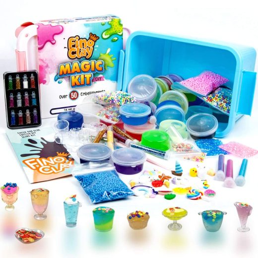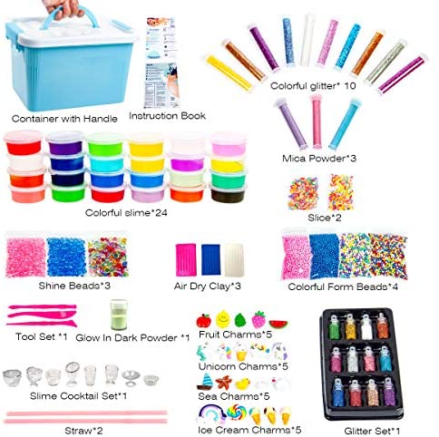 TONS OF COLORS AND ACCESORIES- Open the slime containers and discover the many accessories to choose from , over 20 glitter tubes, 10 cups plus cutting tools, lots of beads, fish bowl included. Its all premade, no mess, enjoy some quality family time with this all inclusive kit GREAT GIFT- Make your loved ones happy for a surprise Birthday party or kids indoors slime party, perfect Christmas gift, there is plenty for everyone to enjoy creative fun BONUS TOPPINGS- It’s not just a Slime Kit; its full of Extra fun 🙂 unicorn & rainbow charms, snow powder, rainbow air dry clay, glow in dark powder, ice cream cake confetti, all sorts of cute creations can be made with the kids. Make some crunchy, fluffy, cloud or galaxy slime !! There is a treasure trove of charms right here to discover STORAGE BOX, SAFE TO USE- The slimes come in a beautiful tidy box with a very sturdy make; it keeps slime fresh for later fun. An instruction card is included, we put some easy to follow instructions. The kit conforms to ASTM International Quality Standards, it is safe for children or adults to use GREAT POSSIBILITIES- Kids absolutely love it, It’s a hands on fun way to boost their creativity, they get to explore art crafting through their senses, recognize colours, improve their intellectual development, motor skills, hand eye coordination