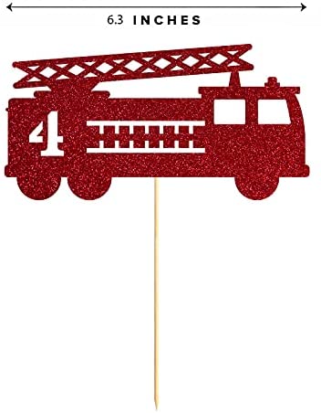 Fire Truck 4th Birthday Cake Topper, Red Glitter Firefighter Fireman 4 Years Birthday Party Decoration