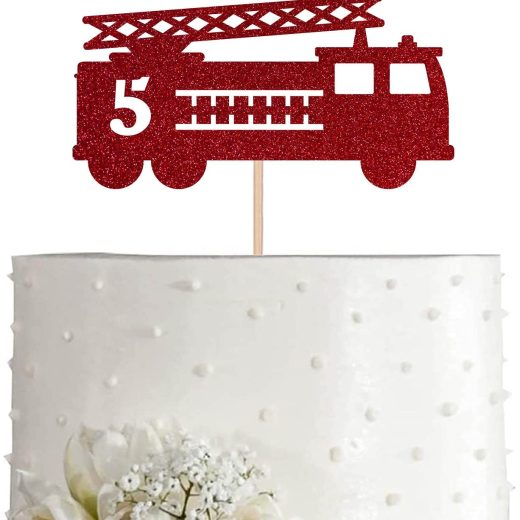 Fire Truck 5th Birthday Cake Topper, Red Glitter Firefighter Fireman 5 Years Birthday Party Decoration