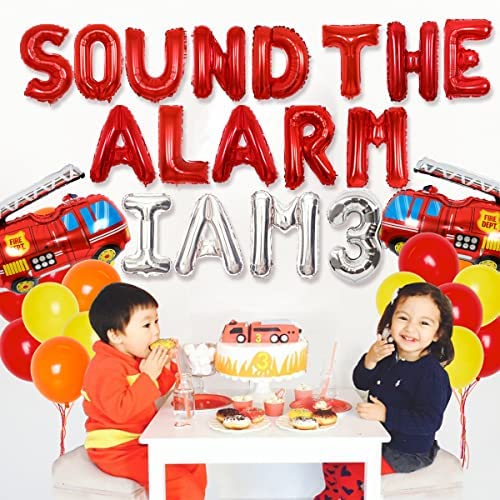 FIRE TRUCK PARTY DECORATIONS: Package includes 75 different size latex balloons, 1 set of sound the alarm i am 3 foil balloons 16 inches, 2 fire tr…