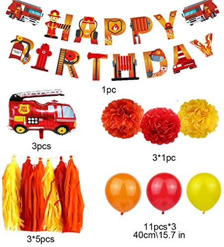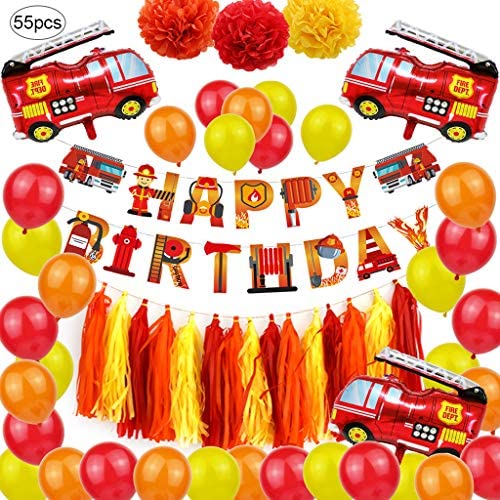 Fire Truck Party Decorations, YimaiX 55PCS Fire Truck Party Supplies with Fire Truck Balloons Pom Poms Tassels Happy Birthday Banner for Fire Truck Baby Shower Birthday Party Supplies