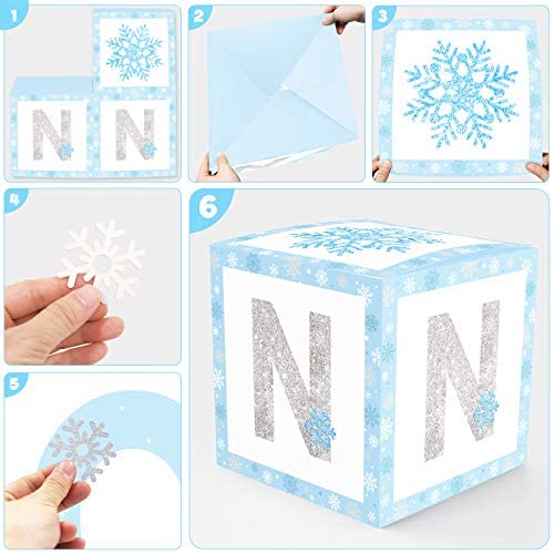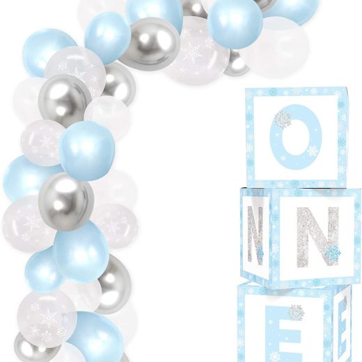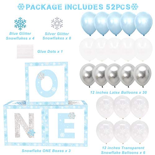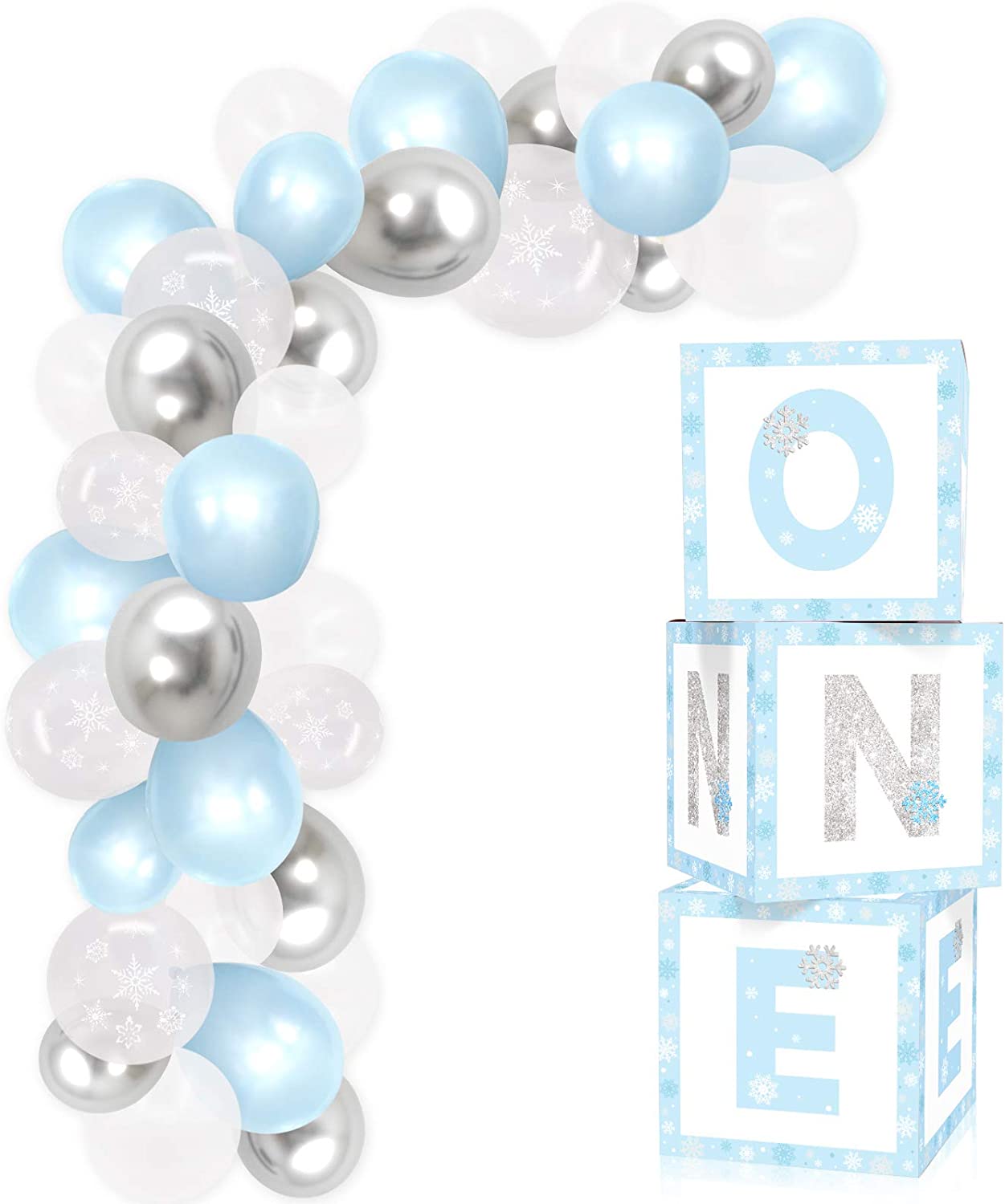 First Birthday Balloon Boxes Decorations Blue White Winter Onederland 1st Birthday Boxes Blocks for Baby Boys Girls Holiday Snowflake Birthday Party Supplies Cake Smash Photo Props Backdrop