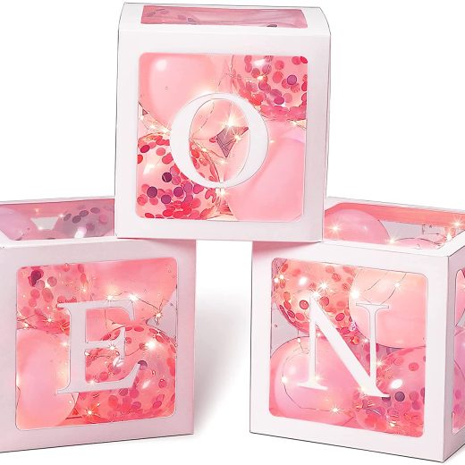 Birthday decor with balloons and boxes this birthday balloon box set contains 32 pieces of latex and confetti balloons and 3 pieces of LED string lights, 3 pieces of clear balloon boxes, 3 pieces of decorative thick cardboard letters O, N, E and 8 pieces of double-sided sponge tapes, which is a nice combination to make your party attractive and impressive Flexible and creative you can freely paste the O, N, E letter thick cardboard on the balloon boxes, and put LED copper wire lights and balloons into the box; Of course, you can also put other decoration, there are no restrictions on the way the balloon boxes are placed, convenient for you to adorn as your preferences and needs Simple install these pink balloon boxes come in pre-folded and flat, the string lights are equipped with button battery; You can set the boxes up and paste O, N, E letters to the boxes with double-sided sponge tapes, then put in inflated balloons and string lights to complete your birthday photo decoration props Nice photo backdrop each clear balloon box measures approx. 11.8 x 11.8 x 11.8 inch/ 30 x 30 x 30 cm, each string fairy light has 15 LED beads and it is recommended to blow the balloons to size approx. 5 inch/ 12.7 cm in diameter; You can take photos with the ONE balloon boxes Reliable quality these birthday decoration boxes are made of durable paper and quality PVC, sturdy and wear resistant, not easy to deform or break, and the light strings are made of copper wire that will not overheat after a long time usage, comfortable for you to use, moreover, compact in size and light weight, portable for you to carry and store