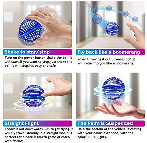 Coolest Flying Toy and Perfect GifThe hover ball reimagined globe shape and more powerful motor mean one thing: more mind-blowing tricks than ever. Flex your skills with these advanced stunts and maneuvers that will push your creativity and test your accuracy. Perfect for kids, teenagers, adults, Elderly. These mini flying drones make awesome travel toys, gifts and fun birthday party activities. Safe & Special Design This Outside boomerang spinner drone is a hoverball action toy that can find its way back to you like the boomerang. The spherical design and protective casing mean it’s completely safe to grab with your hands. And the material is surprisingly soft and light, so getting a bump from the flying ball iis like a pat on the shoulder. In the age of social distancing, it’s the perfect way to keep kids moving so they don’t turn into couch potatoes during lockdown. Rechargeable And Portable:Power it up by USB cable for 20 minutes to get fully charged and a single charge will give you a full 30 minutes of tricked out flight time.Wherever you go,the drones for kids can easily carry, and will not take up a lot of space. Perfect Gift For Anyone:These cool manual flying balls hoover ball can be used as exquisite Christmas gifts and creative birthday gifts for your family and friends. Colorful, interesting, attracting the attention of children and adults Upgraded Flying ToyThe floating ball Drone offers a unique addition to the 1st generation flynova.Send your Boomerang Orb Drone flying sky high – up to 49 feet – then reel it back in for the catch using the controllers magnet attraction system. And with three different colored lights, you can light up the sky with any color you choose.