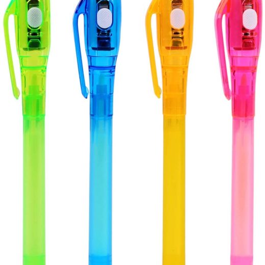 WRITE YOUR SECRET MESSAGE Once your secret message is written with this invisible ink pen, you just need to wait for a few seconds and use the light on pen cap to make the words appear, so funny and amazing EXCITING SPY ACTIVITIES FOR PARTY You will love these spy pens; People love using this kind of pen to keep their secret and play detective spy games; Invisible pen brings you an amazing variety of fun activities. From Surprise birthday parties, to reviling a top secret message to their parents or grandparents GREAT GIFT FOR FUN PARTY FAVORS This invisible Spy Pen comes in a pack of 8; Assorted colors to make the activity more exciting and fun; Parents could buy it for their loved ones party at home; Teachers can buy it for students for a school Activity. Add it for any surprise gift bag or as Stock Stuffers PACKAGE INCLUDES4 reuseble invisible magic pens with built in lights. Batteries included and installed; Pens will come in a variety of colors (1*Pink, 1*Yellow, 1*Green, 1*Blue) to keep the activity exciting BUY WITH CONFIDENCE If for whatever reason you are not completely satisfied with our product, please contact us and our customer service team will get it resolved in 24 hrs/7 days