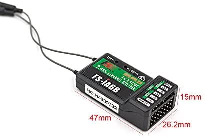 Flysky 2.4G 6CH FS-iA6B Receiver PPM Output With iBus Port This FlySky FS-iA6B 6ch Receiver works great with the FlySky FS-i6 Controller. This compact 6 channel receiver is great for any model usingup to 6 channels and, with a range exceeding 500 meters, it can beconsidered to be full range for all but the most demanding of applications. The receiver has end-on connectors to enable a neat installation in tight spaces. Built in connectors allow you to use any of the optional FlySky telemetry sensors. Dual antennas give the FS-iA6Bexcellent reception and interference rejection capability. With easybinding, compact dimensions, optional telemetry and dual antennas! Description: Name: Flysky Item Name: FS-iA6B Channel: 6 Frequency Range: 2.4055–2.475GHZ Band Width Number: 140 Transmitting Power:20dBm RF Receiver Sensitivity: -105dbm 2.4G Mode: The second generation of an enhanced version of the automatic FM digital system Encoding: GFSK Antenna Length: 26mm * 2 (dual antenna) Input Power: 4.0-6.5V DC Dimension: 47 x 26.2 x 15mm Weight: 14.9g Color: Black i-Bus Interface: Yes Data Acquisition Interface: Yes Model Type: Airplane / Glider / Helicopter Compatible Transmitter: Compatible with FS-i4,FS-i6,FS-i10,FS-GT2E,FS-GT2G Package Included: 1x Flysky FS-iA6B receiver 1 x Bind plug