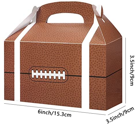 Applicable ageChildren and adults.Package includes24 Pcs Football treat boxMaterialsFootball gift bags Made of paper.Applicable ScenariosYou can use Football treat box to pack snacks and candy to give gifts in the Football match parties or birthday party.