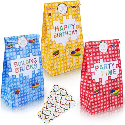 Package Included: 24Pcs building bricks block candy treat gift bags and 24 round stickers. There are 3 designs: red, blue and yellow, 8 bags per de…