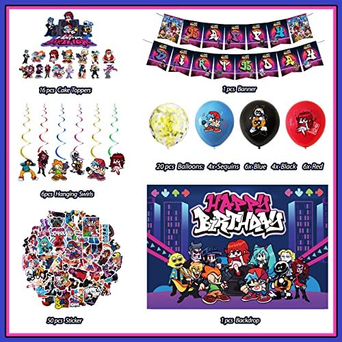Friday Night Party Supplies, Funkin Birthday Party Decoration Including 5 x 3 FT Backdrop, Banner, Hanging Swirls, Cake Topper, Sticker, Balloons for Friday Night Video Music Game Funkin Birthday Party
