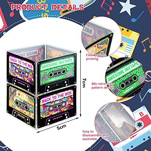 Suitable size: each 80s cassette tape pattern cube measures approx. 18 x 14 x 14 cm/ 7 x 5.5 x 5.5 inches, that the proper size is suitable as a table centerpiece to holding neon bracelets, cool sunglasses and more at 80s theme party Where to apply: these 80s party decorations can be placed on the dessert table, windows, mantelpiece, floor, shelf, kitchen, living room, or other places, to decorate your birthday party, 80s themed party, home gathering, and more, creating a happy and exciting party atmosphere 80s theme design: these retro party buckets are designed with 80s elements, such as the classical cassette tape patterns, and the flamboyant colors can show the 80s style, that the delicate design makes party decorations an impressive addition to any 1980s parties Suitable size: each 80s cassette tape pattern cube measures approx. 18 x 14 x 14 cm/ 7 x 5.5 x 5.5 inches, that the proper size is suitable as a table centerpiece to holding neon bracelets, cool sunglasses and more at 80s theme party Where to apply: these 80s party decorations can be placed on the dessert table, windows, mantelpiece, floor, shelf, kitchen, living room, or other places, to decorate your birthday party, 80s themed party, home gathering, and more, creating a happy and exciting party atmosphere