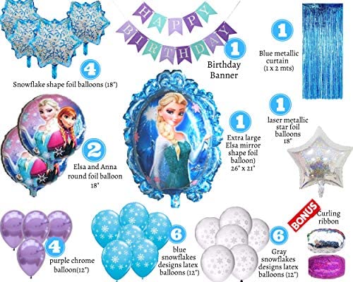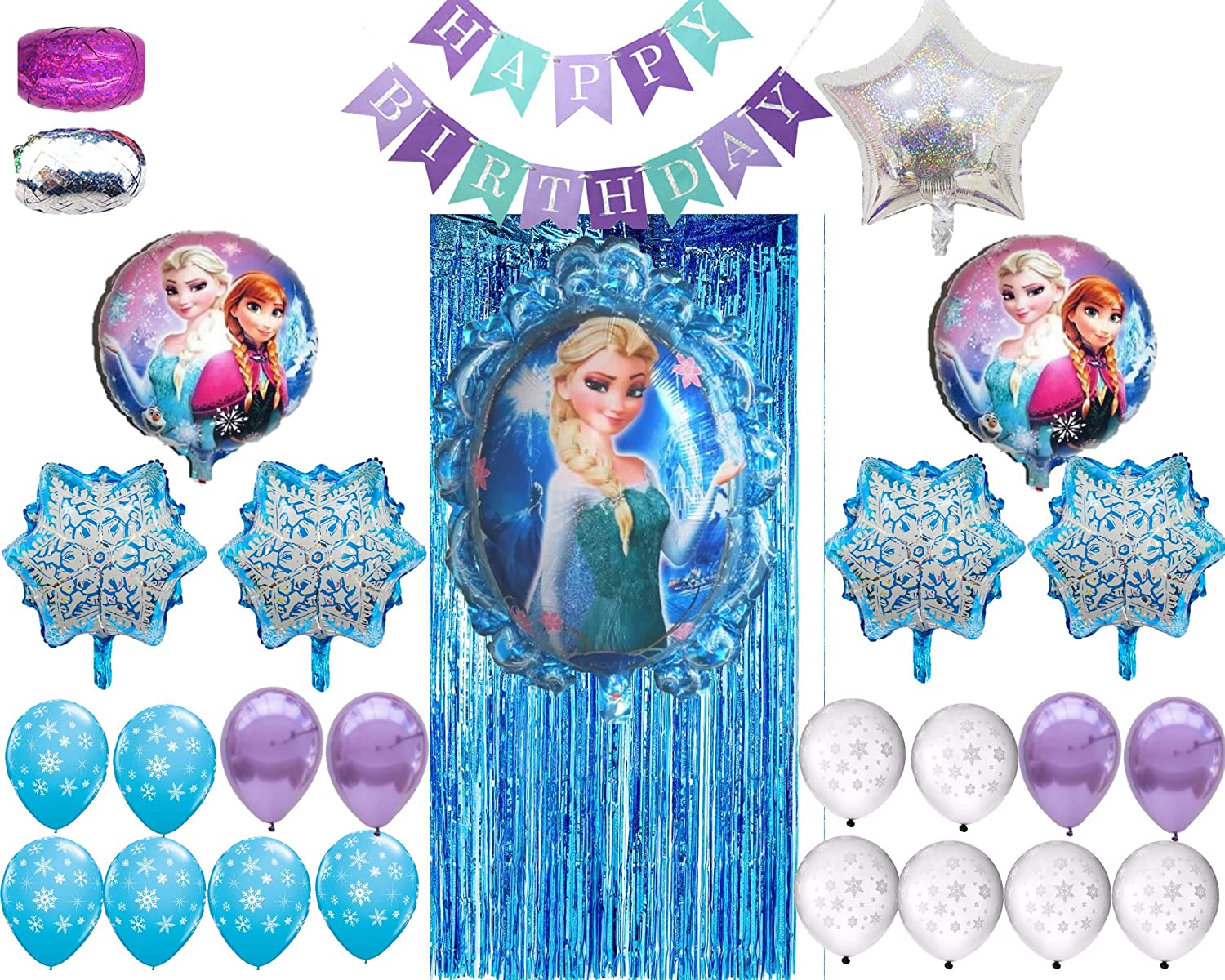 Frozen Birthday Party Supplies. Elsa and Anna Balloon Bouquet. Snowflakes Balloon. Metallic Tinsel Foil Fringe. 28pc party decoration kit.