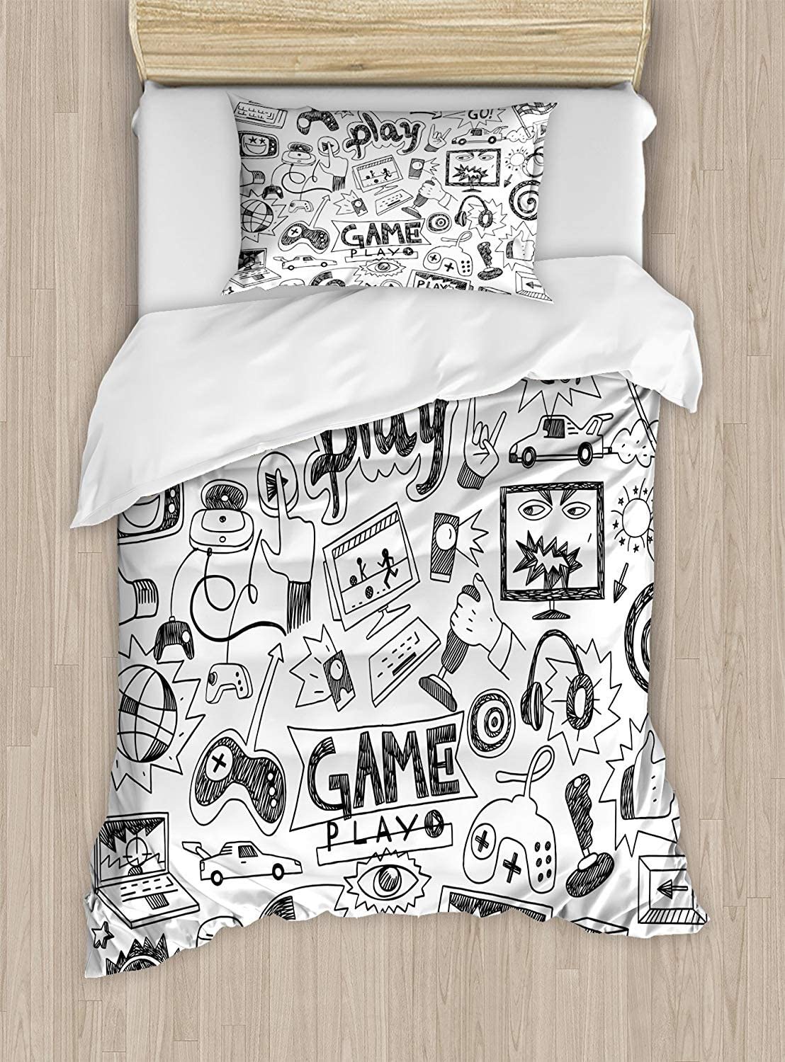 Full Bedding Sets for Boys, Video Games Duvet Cover Set, Monochrome Sketch Style Gaming Design Racing Monitor Device Gadget Teen 90s, Cozy House Home Collection 4 Piece Bedding Sets