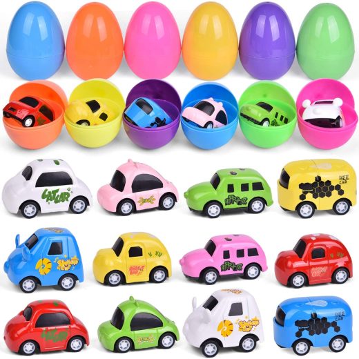 Preschool Toys Cars: 12 pre-filled Easter eggs, each have a metal die-cast vehicle toy tucked inside; 6 assorted bright colored surprise eggs: pink, green, blue, purple, yellow & orange. Easy to Play: Pull back & go, simple pull back vehicles to send them rolling forward; the all diverse cartoon vehicle set prefilled in surprise eggs. Unique Design: Cute car toy has special personality with bright color, kids will like these candy color pull back cars. Egg measures 3.5 inches tall by 2.4 inches width, Cars measure approx 2.5 inch, The childs small hand can easily catch the car, professionally designed for kids. High Security: Superior quality, 100% non-toxic, phthalates-free and lead-free metal alloy cars for kids; ASTM, CPSIA safety of toys certified. our eggs have thicker shells than others. Perfect Gifts: Perfect gifts as Easter egg fillers for 3,4,5,6,7,8,9 &10 year children Easter egg hunt event, great for Easter party favors supplies, holiday gifts, goodie bag fillers, stocking stuffers, carnival prizes and more.