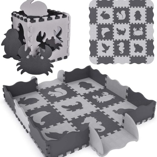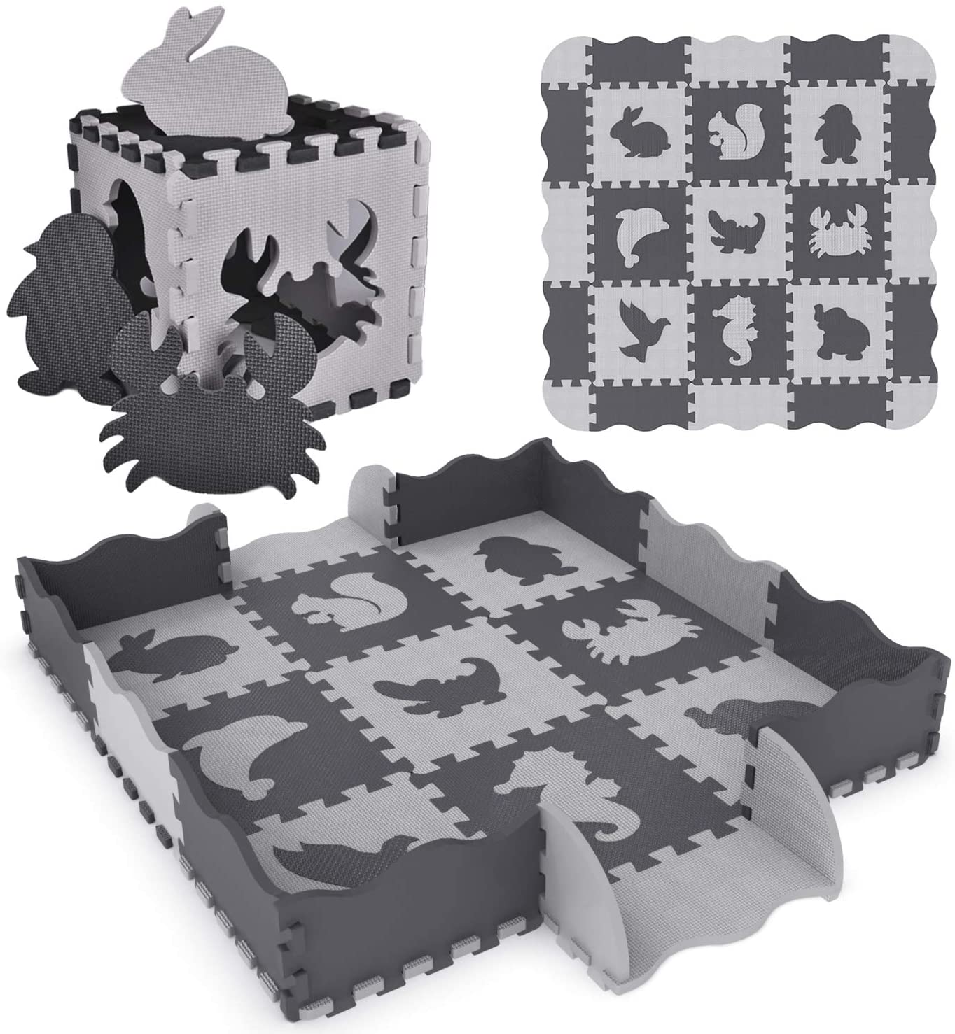 25PCS Interlocking Foam Tiles Baby Crawling Mats include 9 Tiles Play Mats + 12 Tiles Fence Mats + 4 Tiles Gate Mats Baby Crawling Play Mat- Flat Size: 45.5’’ x 45.5’’, Fence Up: 34.2’’ x 34.2’’, Fence Height: 6.3’’, and Each Tile is about 11.81’’ x 11.81’’; approx. 0.47’’ Thickness mat comfortably cushions spine, hips, knees and elbows on hard floors Superior Quality EVA Foam Interlocking Tiles, 100% free of BPA, lead, phthalates & heavy metals; Meet ASTM, CPSIA Standards and exceed the US Toy Safety Standards, New playmat that is freshly printed may occur a slightly odor. Just put the mat in a well-ventilated place for a few days and it does not smell anymore. Non-skid, Waterproof & Stain Resistant foam tiles can be used on hardwood floors, tile, concrete surfaces provide extra soft cushioned mat to protect your babies from all the little bumps associated with crawling, learning to sit and walk A variety of Cute Animal Patterns: rabbit, penguin, squirrel, dolphin, crab, pigeon, sea horse, alligator & elephant.