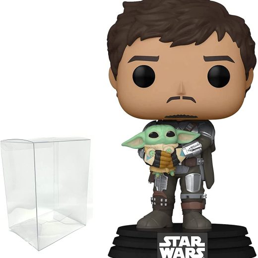 Funko Pop Bundle – 1 Star Wars: The Mandalorian – Mandalorian (Din Djarrin) Holding The Child (Grogu) Vinyl Figure with PET Plastic Box Protecter