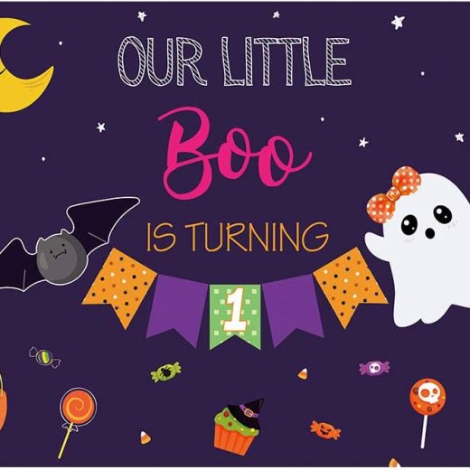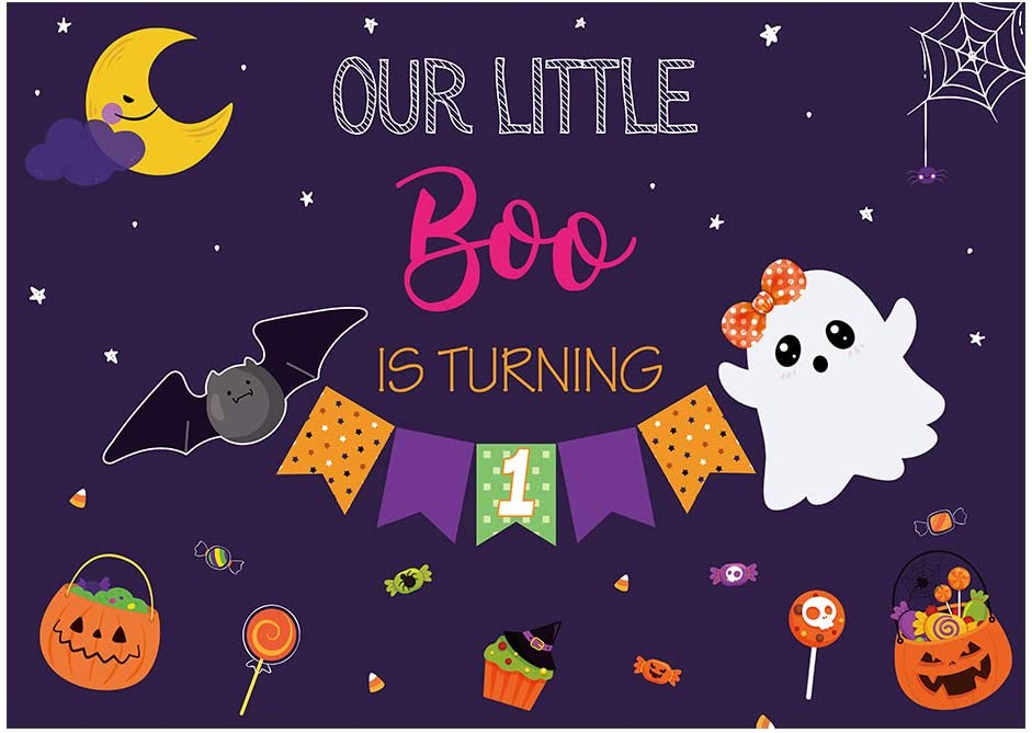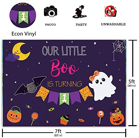 Funnytree Halloween 1st Birthday Party Backdrop Our Little Boo is Turning One Background for Baby Boys Girls First Birthday Night Pumpkin Cake Table Decorstions Banner Supplies 7x5ft