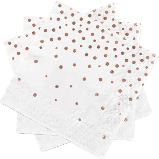QUANTITY AND DIMENSION: 50 Pack, 13X13(unfolded), 6.5X6.5(folded) CLASSIC COLORS COMBINATION & ELEGANT DESIGN: the napkins are composed by classic colors including white and rose goldrn. We choose gold stamping dots to make the design more attractive and exquisite. You can easily create an elegant party atmosphere. DISPOSABLE AND CONVENIENT: the disposable napkins for lunch and dinner or serve for party are all printed with food grade water-based ink which is suitable for food contact. It’s convenience to save your time by eliminating the need to wash fabric napkins. PREMIUM QUALITY: the paper napkin is 3-ply to ensure that it doesnt tear easily and has high water absorbent quality when used. WIDELY USE IN VARIOUS OCCASIONS: decorate your party more unique and beautiful by using these white and rose golden napkins. A little simple decoration can make your party to attract the attention of all guests. You can also use it to decorate your different parties for kids and adults. For example: bridal Shower, baby shower, wedding, anniversary party, cocktail party, birthday Party, Thanksgiving, Christmas and outdoor events