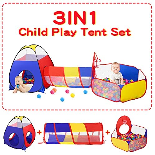 Endless Fun: Children love this 3 in 1 ball pits for toddlers, which is composed of unique shape play tent and baby tunnel. Throwing the balls for ball pit into the basket hoop encourages kids physical play and stimulates the imaginations at any time. Let your babys imagination grow wildly with this perfect toddler playset! Creative Kids Playhouse: Children can separately use the kids tent tunnel to crawl through or combine the tunnel with the fort tent as an extension. In addtion, you children can get more playful experience with combining the tunnel with the ball pit. The best Creative toddler toys tent to play imagination. Multiple Occasions Play: This kids ball pit is easily portable that can be taken for parties, jungle gym, playground backyard or at home! Ensure wherever you go, your children can continue playing hiding, crawling, jumping and retreating endlessly in the indoor outdoor playhouse tent. Also great crawling toys for dogs, cats, and pets as well. Lightweight and Portable: Fast assemble and storage. This toddler tent pops up in seconds. Effectively save your assembly time and energy. So easy to fold into the zipper carrying bag for convenient storage or taking for outdoor play. Give it as a Birthday gift for 3 years old girls and boys. Safe and Durable: Made from the high quality polyester and breathable mesh fabric which can withstand any kids inquisitive play, ensuring your children the safest enjoyable experience. This playhouse for kids outdoor will be ultimate addition to their play set.