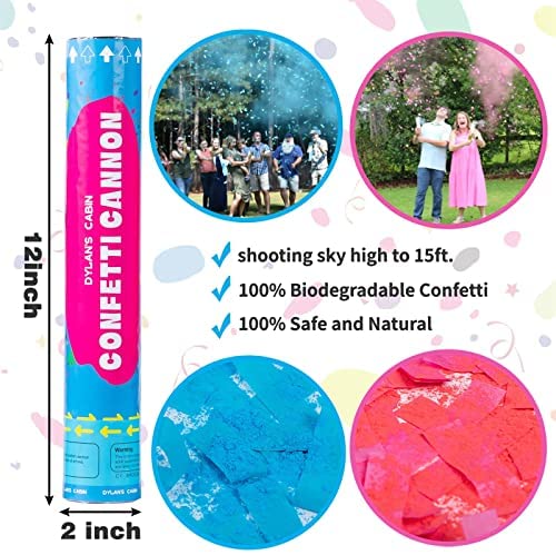Baby Reveal ShowerKeep everyone guessing until the gender reveal cannons are launched and the confetti and powder explode revealing the babys gender. When its time for the reveal, simply cover the bottom with the yellow stickers provided. 2 Pack Blue/PinkThis is a unique and safe gender reveal confetti.Ours hold TWICE the amount of powder than most competitors and also goes HIGHER! ZERO CleanupWe use colored cornstarch just like you would see at fun runs. Our Confetti is made of rice paper and will melt away with water. How to useHold with bottom to ground or to the side of body. Hold top firmly and twist base. All cannons have a kick and a nice audible *pop. Quality AssurancePlease be assured that Please feel free to contact us if you have any dissatisfaction of our confetti cannons, we will back it up with a guaranteed replacement or refund.