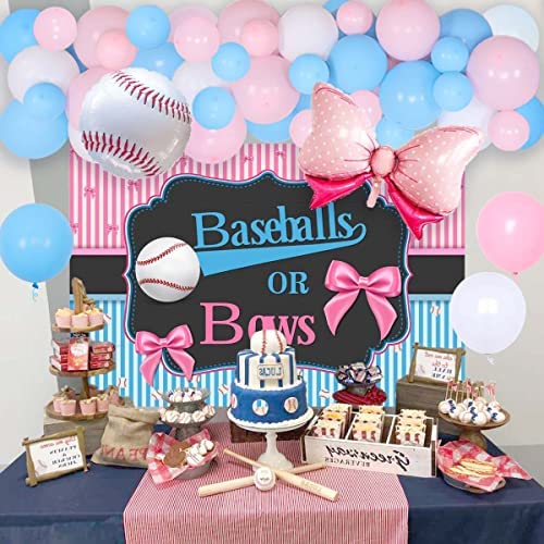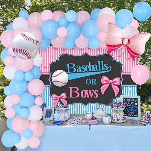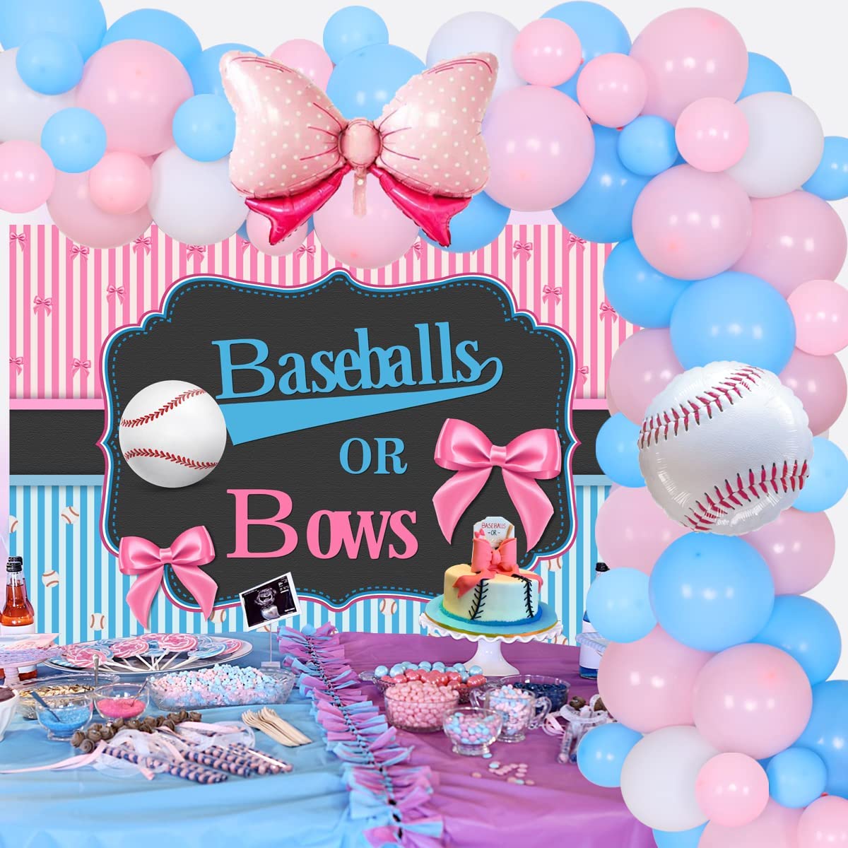 Gender Reveal Party Decorations Baseball Gender Reveal Party Supplies Baseballs or Bows Decorations with Backdrop Latex Balloons for Boys and Girls Baby Shower