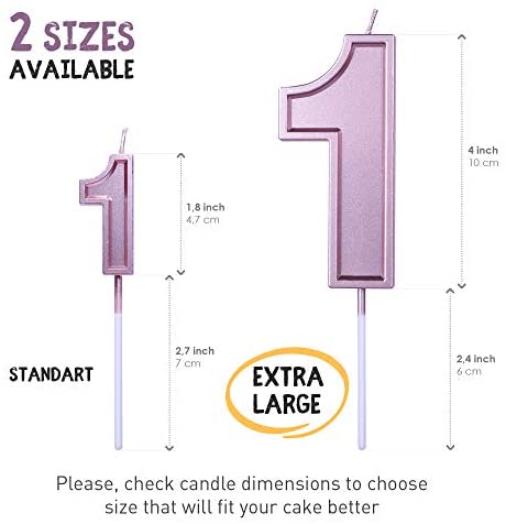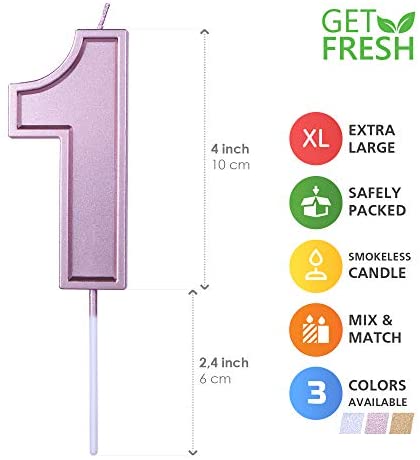 ? PREMIUM QUALITY ? – GET FRESH number birthday candles are made of SMOKELESS WAX, as well as they are NON-TOXIC. Each large 1 birthday candle is safely packed in premium quality craft paper box. ? MIX & MATCH ? – combine our large pink number cake candles on sticks for any occa-sion. You can mix all numbers and find a perfect number solution most suitable for your special day – whether it is for 10-year, 15-year or 21year anniversary. Moreover, our prod-uct is available in 3 colours – rose gold, silver and gold. ? LARGE & ELEGANT ? – Our one year birthday candle comes in astounding rose gold vivid color and glows brightly in the dark. It is easy to light and insert. This pink glitter number candles is 10 cm high (3.94 Inch) without stick, which is really big and can serve as a great cake topper for any party celebration burning evenly and consistently. ? AVAILABLE IN 3 COLOURS ? – our 3.94 Inches number 1 candle is available in 3 colours – gold, silver, rose gold. Moreover, you can find any number you wish. Just visit our Store-front. ? BEAUTIFUL ADDITION TO ANY CAKE ? – these elegant numeral birthday candles will complement any cake and will make this day memorable for you, your family and friends.. This rose gold number 1 candle is of perfect size and quality for any birthday party as well as well as for birthday and weddings anniversaries, reunions or other special occasions.