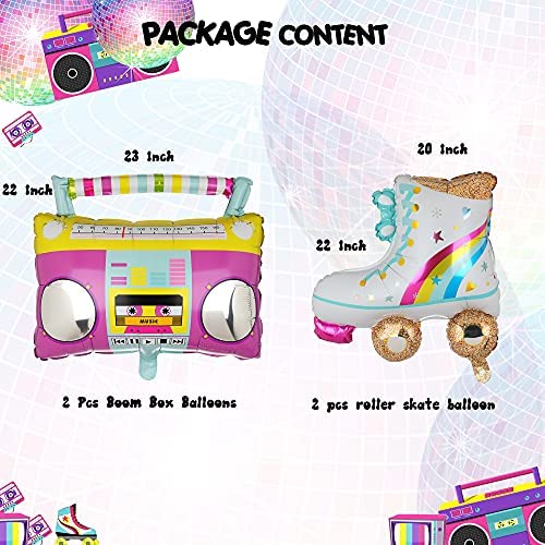 SIZE — 2 pcs 22*20 Inch roller skate balloon,2 pcs 23*22 Inch radio boombox balloon,4 pcs 4D balloons(22 Inch), 2 pcs rainbow print, 2 pcs silver print. MATERIAL– Material of ballons made of high quality foil, color uniform, safe and non-toxic. NOTE- These balloons can be filled with air and helium,balloons filled with air will stay full for up to 70 hours, while with helium will stay full for 3-4 hours,Please keep them away from any heat source or sharp points to avoid melting and breaking! PERFECT PARTY DECORATION — This vintage roller skate balloon is 80s 90s theme party , 80s themed party, 90s themed party,disco fever party,karaoke party, rock and roll party,disco vibes Party, hip hop rappers party decorate,bring you a feeling of back to 80s and 90s . OUR SERVICE — If you have any problem or you need help, please contact us no hesitation , we will solve it for you at once and accept replacement and full refund.