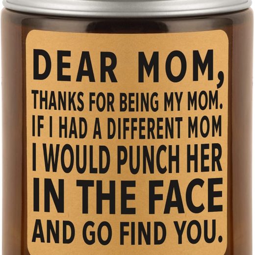 Best Mom Gifts: This is a funny gift idea for a scented candle with a humorous quote that reads Dear mom, thanks for being my mom. this candle makes a unique way to let the most important person in your life keep smiling on a special day; A humorous candle gift idea for mom. Perfect gift for many occasions: Giving this candle is a unique way to make your favorite mother happy with this humorous joke; Perfect for your moms 30th, 40th, 50th, 60th, 70th milestone birthday, or any bday in between. Ideals friendship gifts for girl party, sleepover party, Thanksgiving Day, Christmas, Valentines Day, New Years Day, white elephant, stocking stuffers, graduation. Long-lasting burn time: Lead-Free cotton candle wick burns for 45-55 hours; Provides fresh fragrance which makes your house feel like a home. Lavender scent: Lit it at any time of day or night, smell the sweet-scented lavender fragrance, this candle is great for sleep-promoting and relief from anxiety, depression, and stress.A perfect addition to the bathroom, bedroom, kitchen, living room, office, etc. Eco-friendly and reusable: The candle is handmade with 100% high-quality soy wax and fragrance oils. Our soy wax burns nice and clean and is Eco-friendly! Cotton With Paper Core Wick That Is Zinc And Lead-Free. Wax can easily be cleaned.