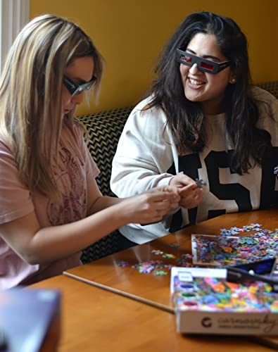 These beautiful jigsaw puzzles explore the interaction between colour and light through the visionary work of Carnovsky. Three different images sit on top of each other, and the resulting picture is unexpected and mesmerising. The colours mix up and the lines and shapes entwine as your eyes try to make sense of what they see. Use the red, green and blue viewing glasses included to isolate each layer of the image, turning one puzzle into three stunning pictures or scan the QR code to turn your device into a magical viewing lens. Contents: 500 Piece Jigsaw Puzzle, Artwork Print of Jigsaw, 3 Pairs Of Viewing Glasses – Red, Green & Blue & QR Code Lens Viewing App All illustrations have been created by the artistic duo Carnovsky, whose RGB artwork was first shown during Milan Design Week in 2010.