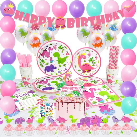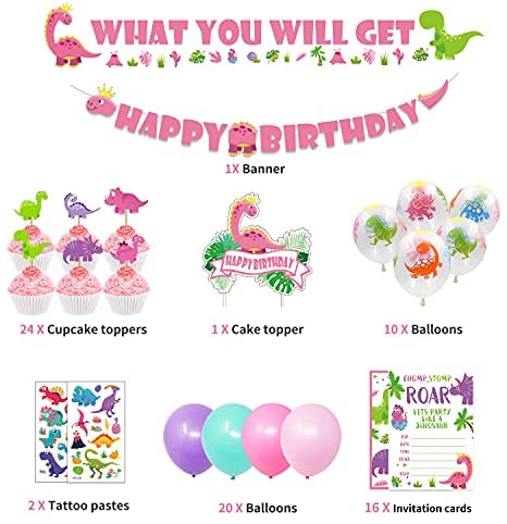 WORTH THE PRICE: Our dinosaur birthday party decorations kit not only has many suits but is also has good quality. Just one set is enough to set up a perfect party for kids girls. WHAT CAN YOU GET IN PARTY: Our dinosaur party decorations set includes 24 Cupcake Topper, 30 Pcs Latex Balloons (5 Styles), 16 Forks, 16 Knives, 16 Spoons, 16 Straws, 16 9inch Plates, 16 7inch Plates, 2 Tablecloth, 16 Cups, 16 Napkins, 16 Invitation Card, 2 Sheet Temporary Tattoos, 1 Banner, 1 Cake Toppers. SAFE AND RELIABLE: Good choice for dinosaur themed fans birthday party. High-quality balloons, not easy to break, be safe for kids. DESIGNED FOR FANS: These dinosaur birthday party supplies are perfect for your dinosaur party, Pink Dinosaur themed party, girl dinosaur party, and so on. SATISFACTORY-Customer satisfaction makes our highest pursuit. If you have any questions, please contact us at any time, We will solve for you within 24h