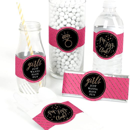 Girls Night Out DIY Wrappers INCLUDES 15 chic pink, black and gold party wrappers and 20 clear stickers. Girls Night Out DIY party supplies are per…