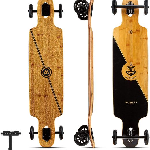 PREMIUM QUALITY MATERIALS An 8 layer laminate with a hard maple core and a beautifully stained bamboo top and bottom sealed with a sand grit finish to show off the beauty of the bamboo. The deck features a subtle reverse camber to keep the deck as low to the ground as possible. This board includes a skate tool to customize your ride to your liking.