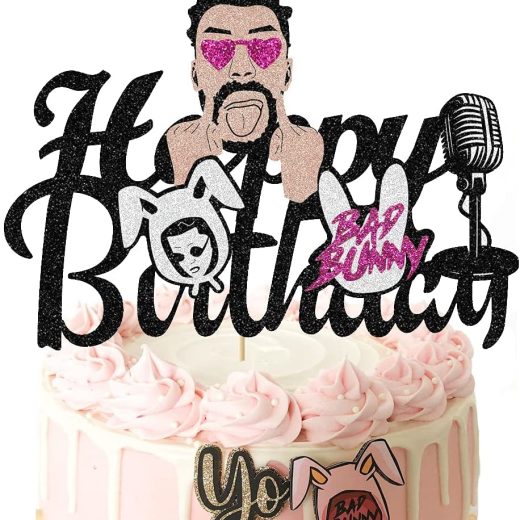 Are you looking for a special cake topper for your bunny rapper theme party Please look here, this cake topper is exactly what you want. The unique design and the perfect size make this cake topper become the most shining and lovely party supplies. PREMIUM MATERIAL: Made of high quality double sided black glitter cardboard & food grade wood stick, which is so durable enough even for next use. Glitter is so shiny under the light and will not fall off.OCCASIONS: Great for bunny rapper themed birthday party! The details design of this cake topper will make the cake memorable on this important occasion. Perfect for bad bunny fans theme party celebrations, disco party, music party, dj party hip pop birthday party. They will be made the home or office look festive.PACKAGE INCLUDES: 1PCS Glitter double sided pre-assembled bunny cake toper, which size is approx. 6.7 inches*4.8 inches, suitable for most size cakes.