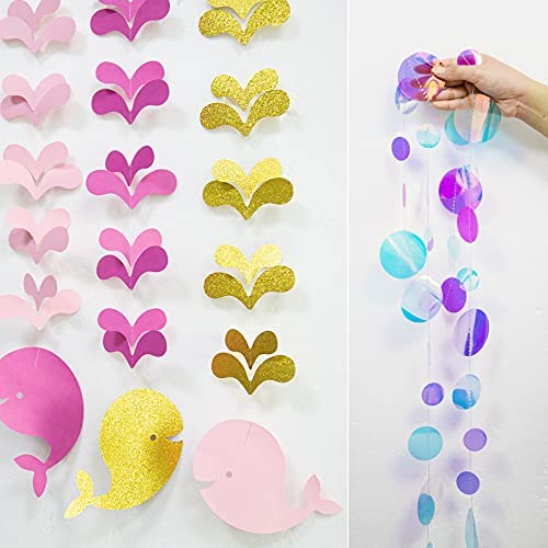PACKAGE INCLUDES: 3 strings of 6 ft holographic ocean blue and rose purple bubble garlands, 3 strings of 2 ft pink or glitter gold whale garlnd, to…