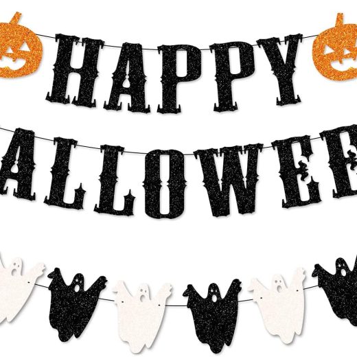 Glitter Happy Halloween Banner Black and White Ghost Garland Happy Halloween Garland With Pumpkin Halloween Garland for Mantle Happy Halloween Fireplace Banner For Mantle Home Decor