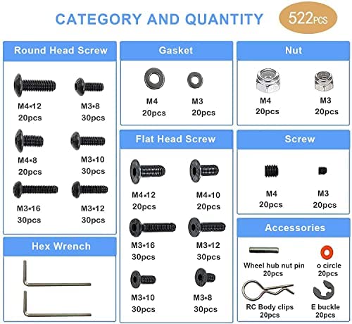 Package Content522pcs included: M3 & M4 Screws (Flat head & Round head), M3 Flat washers,3mm & 4mm Hex Nuts, M3 & M4 Grub Head Screw, M3 & M4 E Buckle, Clip R Pin Rod, Pin, O Circle, 2.0mm Hexagon Wrenches.