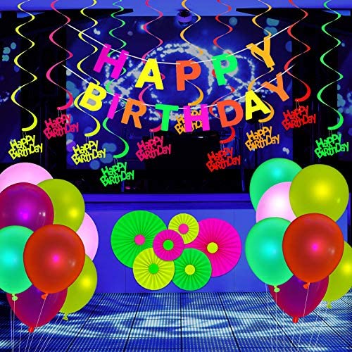 Glow neon party supplies happy birthday banner hanging swirl fluorescent balloons star yellow happy birthday cake toppers star cupcake toppers fluorescent hanging paper fans for glow birthday party Beautiful paper fans and hinging swirls: Fluorescent hanging paper fans in 4 styles, HAPPY BIRTHDAY banner, 10 pieces happy birthday hanging swirl decorations in 5 colors, all are made of quality neon paper in bright colors, lightweight to carry and durable to use, these fluorescent hanging paper fans can be hung on walls, trees, tables, windows or door as background for various parties, which will help add dazzling atmosphere and extra fun to your parties. Balloons: Neon fluorescent balloons are made of quality latex, non-toxic and durable, safe to use and can be inflated with helium, the balloons also have 5 different vivid colors of purple, orange, yellow, green and blue, nice additions that will certainly be a hit at any party or event, make your party decorations impressive. Convenient to use: Neon party decoration supplies have been planned for your convenience, the star hanging swirl decorations are pre-assembled, so you can hang them up directly, and then blow the balloons with air or helium, which will be a huge hit at your neon themed or glow birthday party. Glow under blacklight: These glow party supplies look bright under daylight, but will glow under blacklight and light up fantastically to create a pretty fluorescent effect for your parties, suitable for most occasions, such as black light party, neon themed party, birthday party, wedding party, grow party, stage decoration, carnival, dance party or anywhere that bright neon colors are required. Specifications: Material: neon paper, latex Color: as pictures shown Quantity: 42 pieces totally Package includes: 1 x Happy birthday banner 4 x Fluorescent Hanging Paper Fans 20 x Neon fluorescent balloons 10 x Ha