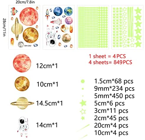 Glow in The Dark Stars Wall Stickers, CAYUDEN 849 pcs Bright Universe Planets Glow in Dark Astronaut Rocket Wall Decals Green Glow Ceiling Stars for Baby Nursery Kids Bedroom Classroom Decoration