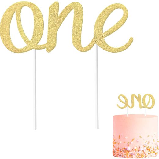 This gold one cake topper is designed for cakes decoration, especially for happy 1st birthday cakes. The character toppers are made with glitter paper stock without shedding. Its safe and non-toxic to insert into cake. It also can be used as a photo prop for your first Wedding anniversary.Features – Color: Gold- Quantity: 1 Pcs Double-side Cake Topper- Size: lettering is 5.7inches wide, 2.2inches tall. The picks are 3.5 inches long- Material: Glittered cardstock with food-safe paper stick