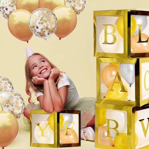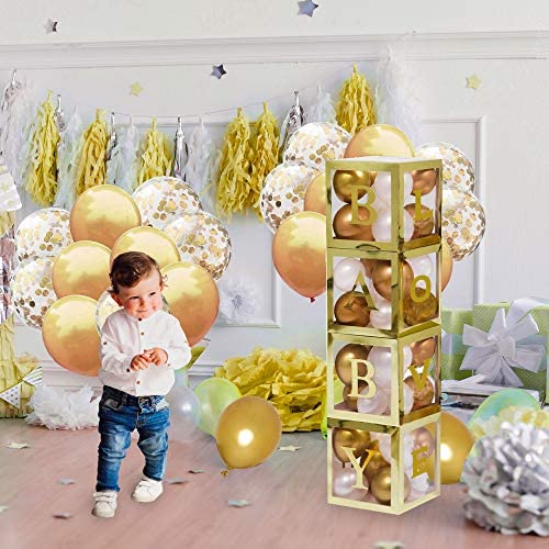 GOLD PARTY DECORATIONS – Golden, sparkly, and truly celebratory baby gender reveal party supplies kit with confetti balloons and stackable baby balloon boxes, ready for unforgettable baby parties; Baby shower centerpieces for a spectacular, elegant photo backdrop creating everlasting memories for years to come GENDER NEUTRAL SET – White and gold baby shower decorations and gender reveal decorations kit is an ultimate all in one gender-neutral party decor for baby boys or girls; Great addition to all baby celebrations and convenient to decorate babys room and nursery 45 PCS SET INCLUDES – 4 x Transparent Block Boxes with Golden Frame, Gold Letters B A B Y and L O V E, 24 x 5 Pearl White Balloons, 12 x 12 Gold/White/Confetti Balloons Bundle, 1 x Roll of Gold Ribbon INSTANT SETUP – Gold baby shower boxes party decorations come ready designed for a convenient, hassle-free display with no tools required; Easy to remove, flat foldable to safely store for all future celebrations VERSATILE PARTY SOLUTION – Ideal as baby shower backdrop, gender reveal decor or neutral baby room decorations for girls and boys; Excellent to fill with party favors, toys, photos or flowers, our clear baby boxes decoration with letters will add luxurious style to any celebrations